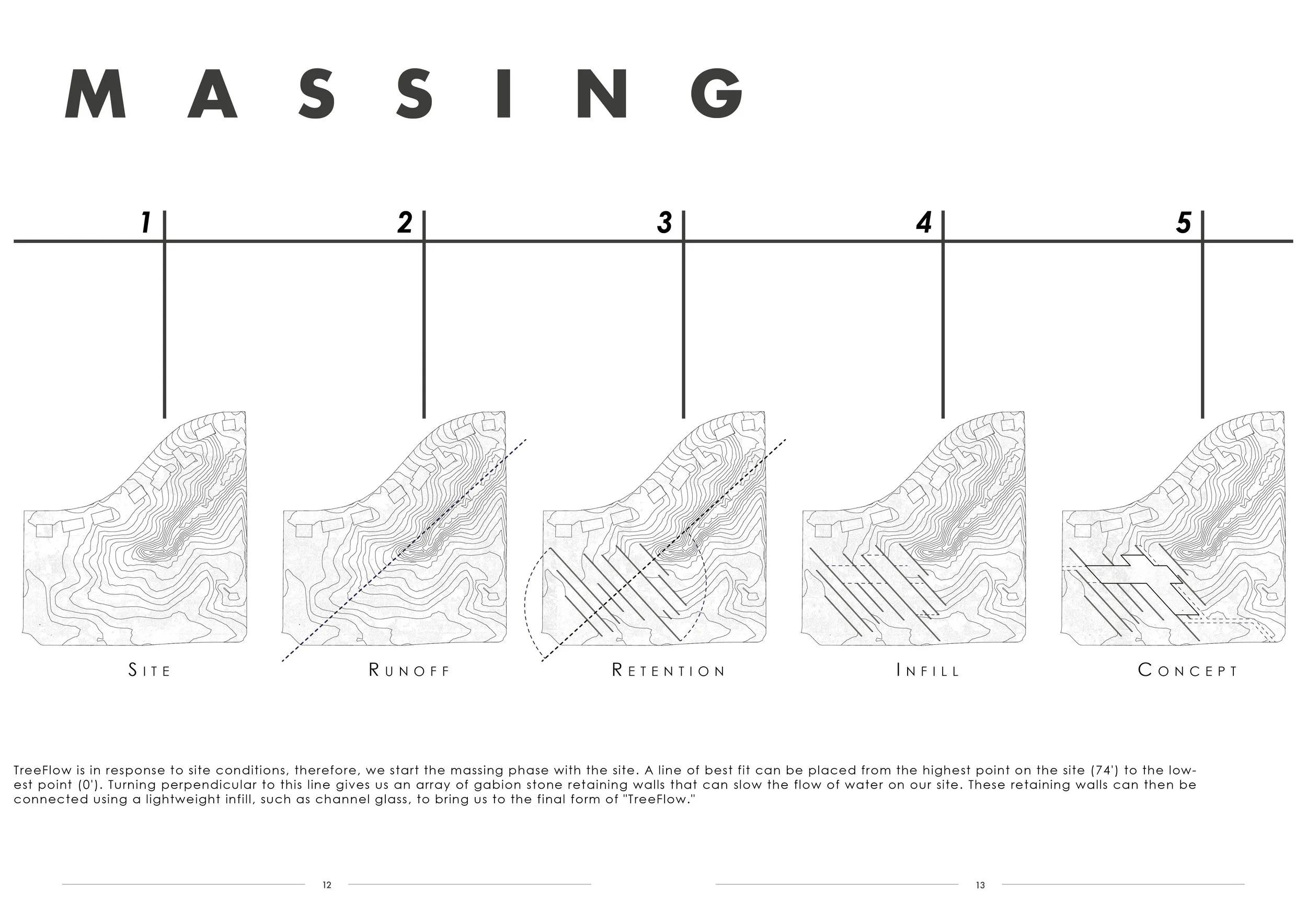 TREEFLOW reimagines architecture as a living, adaptive system within the urban landscape. This project merges sustainable design with ecological restoration, utilizing permeable gabion walls, bioswales, and native vegetation to manage water flow and improve soil health naturally. Positioned as a community hub, TREEFLOW conserves resources and educates visitors on the relationship between built environments and nature, inviting them to experience a firsthand rehabilitated ecosystem.